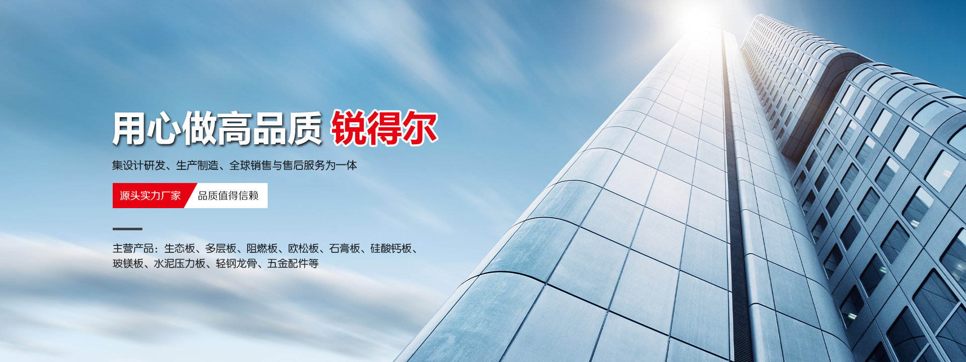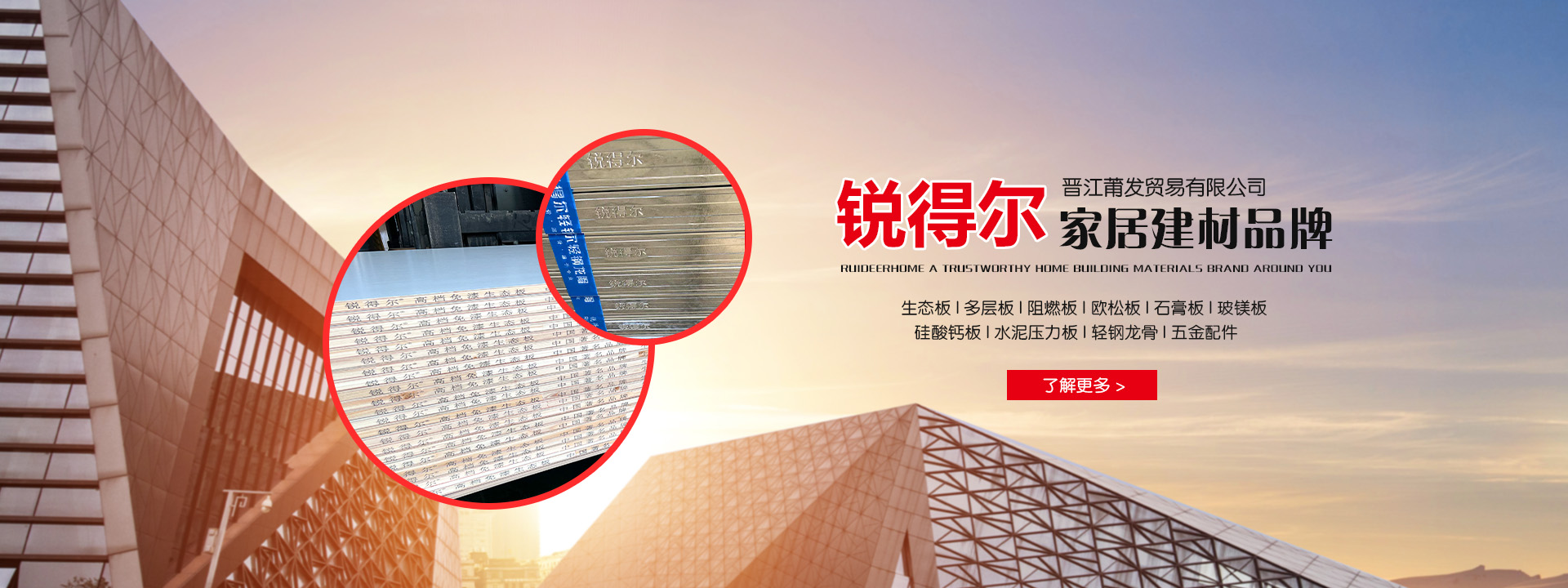 晋江莆发贸易有限公司,公司成立于2016年,坐落于福建省泉州市晋江市池店镇唐厝村南区。多年来,锐得尔秉承“品牌、环保、品质”初心,坚持自主研发创新,为消费者推出绿色健康环保产品,不断实现环保新高度。主营产品包括生态板、多层板、阻燃板、欧松板、石膏板、硅酸钙板、玻镁板、水泥压力板、轻钢龙骨、五金配件等。产品集设计研发、生产制造、全球销售与售后服务为一体。 匠心品质 追求卓越